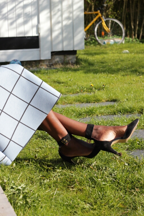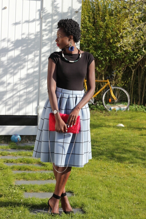 Je commence à avoir une sérieuse collection de jupes « patineuse » en scuba, mais j’ai craqué tout particulièrement pour la longueur de celle ci. Elle y ajoute une touche sobre et élégante qui tranche avec le côté fun et girly des minis. Et entre nous, lorsque comme moi on n’a pas encore réussi à vaincre (oui on va considérer que j’ai essayé 😀 d’accord?… ahem…) la mini bouée post bébés, la combinaison taille haute/coupe évasée/scuba est un cadeau des dieux de la mode.