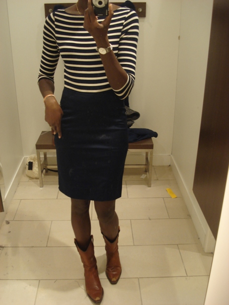 Alors ca fait la mariniere, la jupe bleu marine et la jupe noire, toutes trois de chez H&M (vous remarquerez que je me suis fait violence et que je n’ai pas cede a la blouse a pois, non? z’etes durs…). La 4e photo, c’est mon jean J Brand que j’aime, un top achehem aussi! et mes santiags Ash adorees qui ont fait la guerre, ma petite piece qui est passe tour a tour neuve, favorite, it et vintage dans mon shoesing!