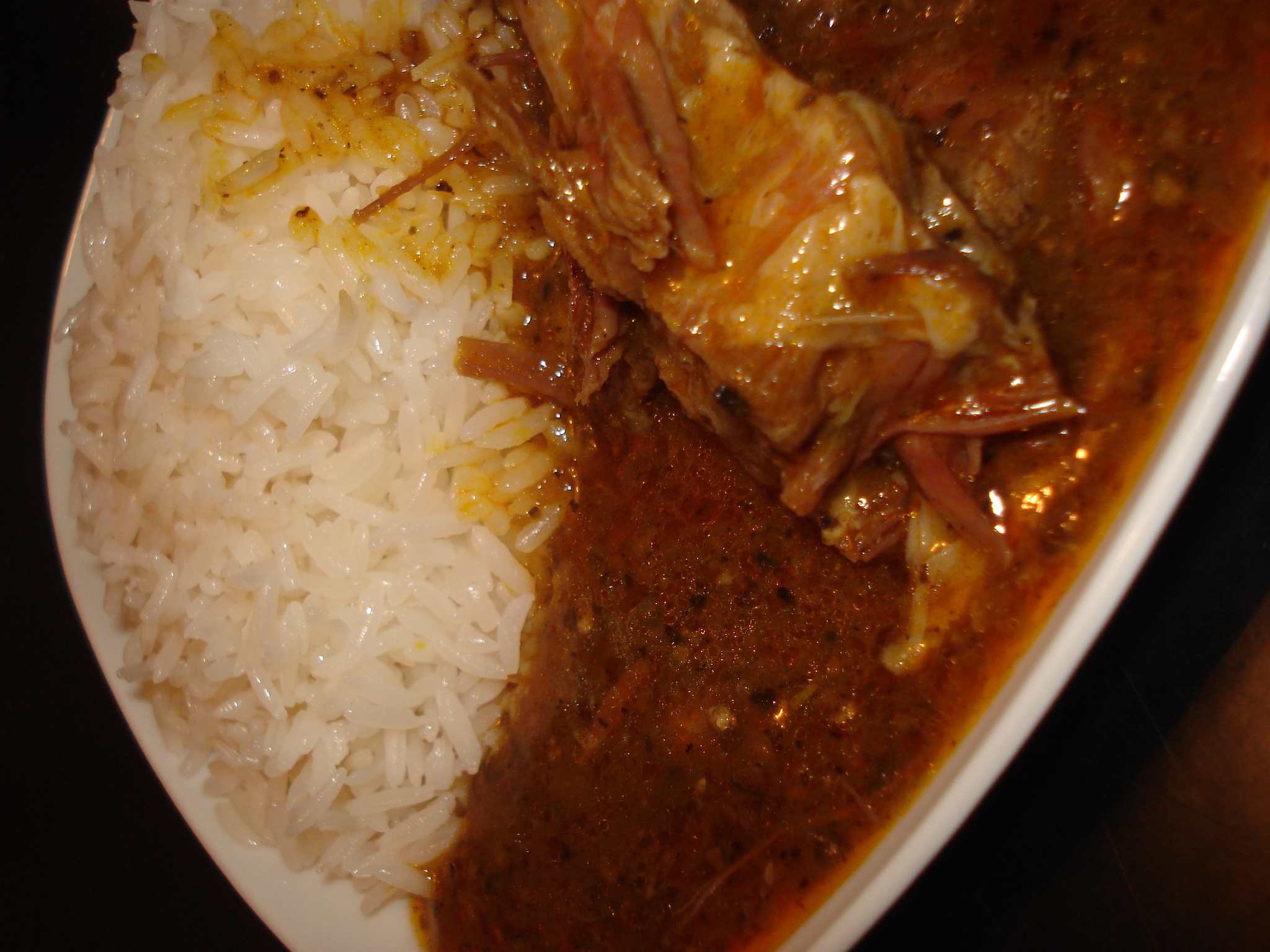 Deux tomates, un oignon, 400 g d’huile de palme, 3 CS de djoumgle, env 300g de pinnekjøtt et je-ne-sais-plus-qu’elle-quantite-d’eau plus tard, le resultat etait juste bluffant! Une sauce djoumgble digne de la cuisine de ma maman! Le pinnekjøtt donnait vraiment un delicieux parfum fume, et je n’ai pas eu besoin d’ajouter du sel, celui qui degorgeait de la viande a suffit a l’assaisonement! J’avais deja diner, mais je n’ai pas pu m’empecher de me faire cuire du riz et de savourer ma desormais baptisee « Sauce Djoumble au Pinnekjøtt de Tato* »