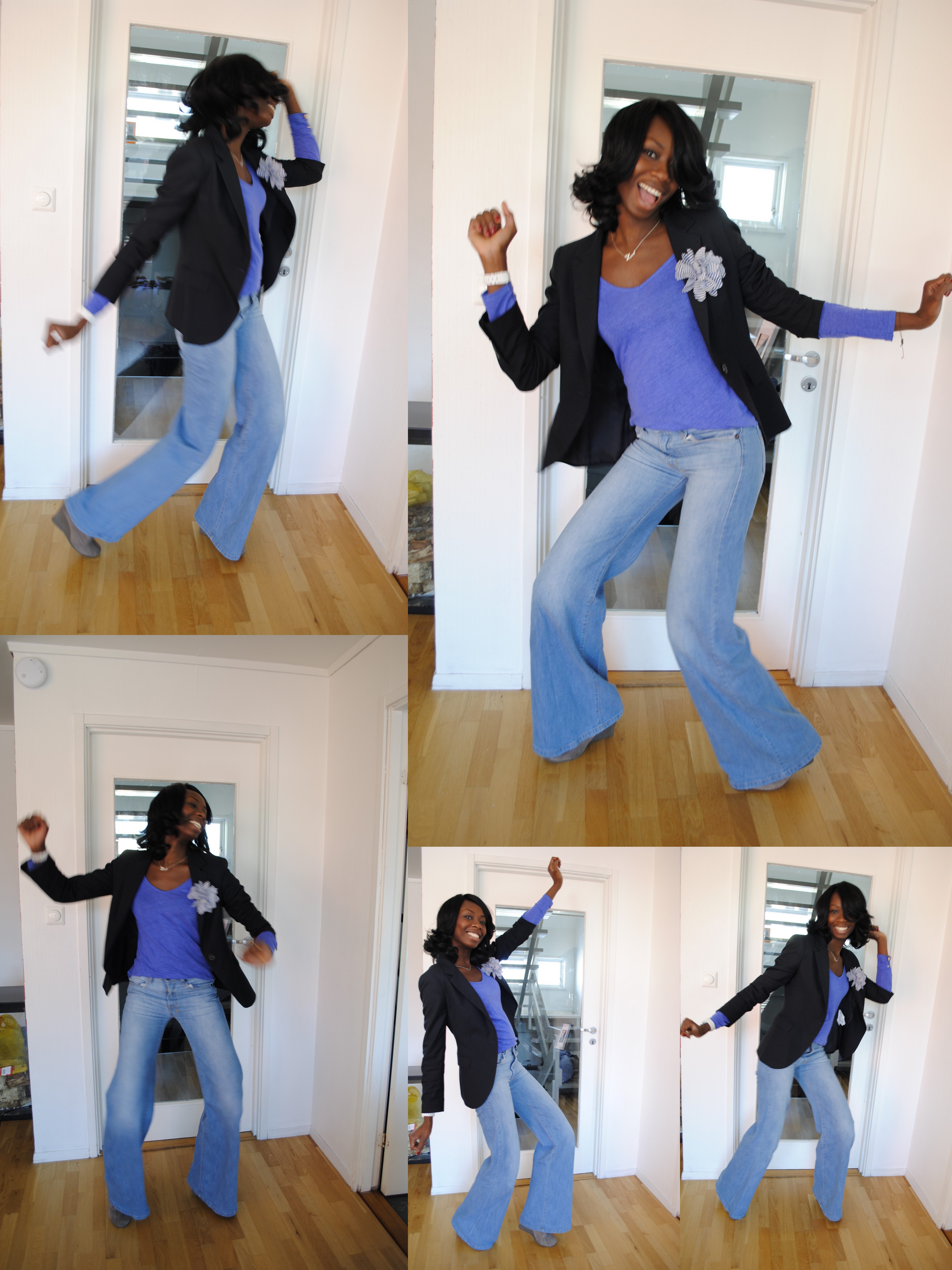 j’adore le jean + veste et le pti detail avec la broche fleurie.
