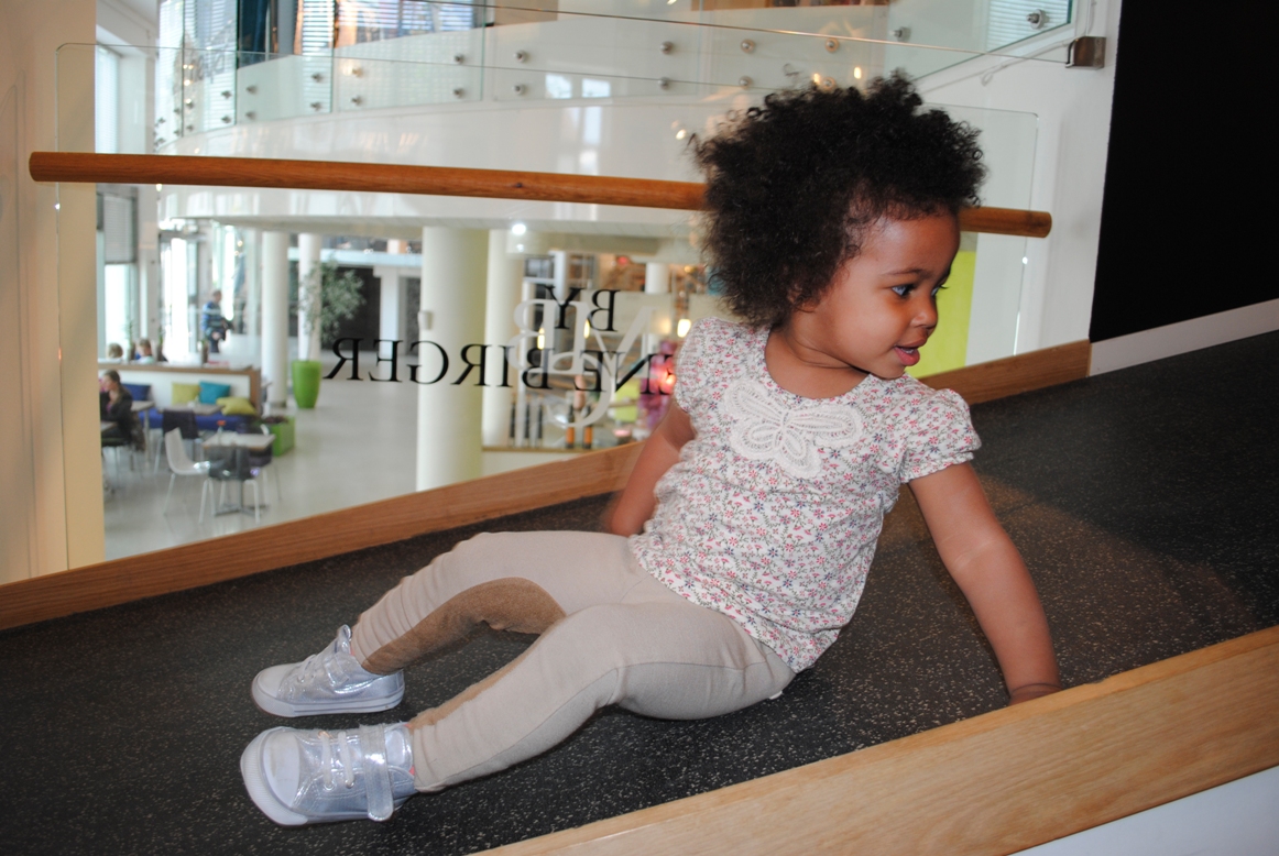 Je l’ai vue, et je n’ai plus voulu la quitter, mais j’ai bien du, la coquine n’est pas donnée. Et pendant que je rêvassais à la vie de rêve que cette robe pourrait avoir auprès de moi, Amayah avait trouvé l’aire de jeu parfaite, entre les escaliers, les portants et la rampe d’accès, qu’elle a accessoirement prise pour un toboggan!