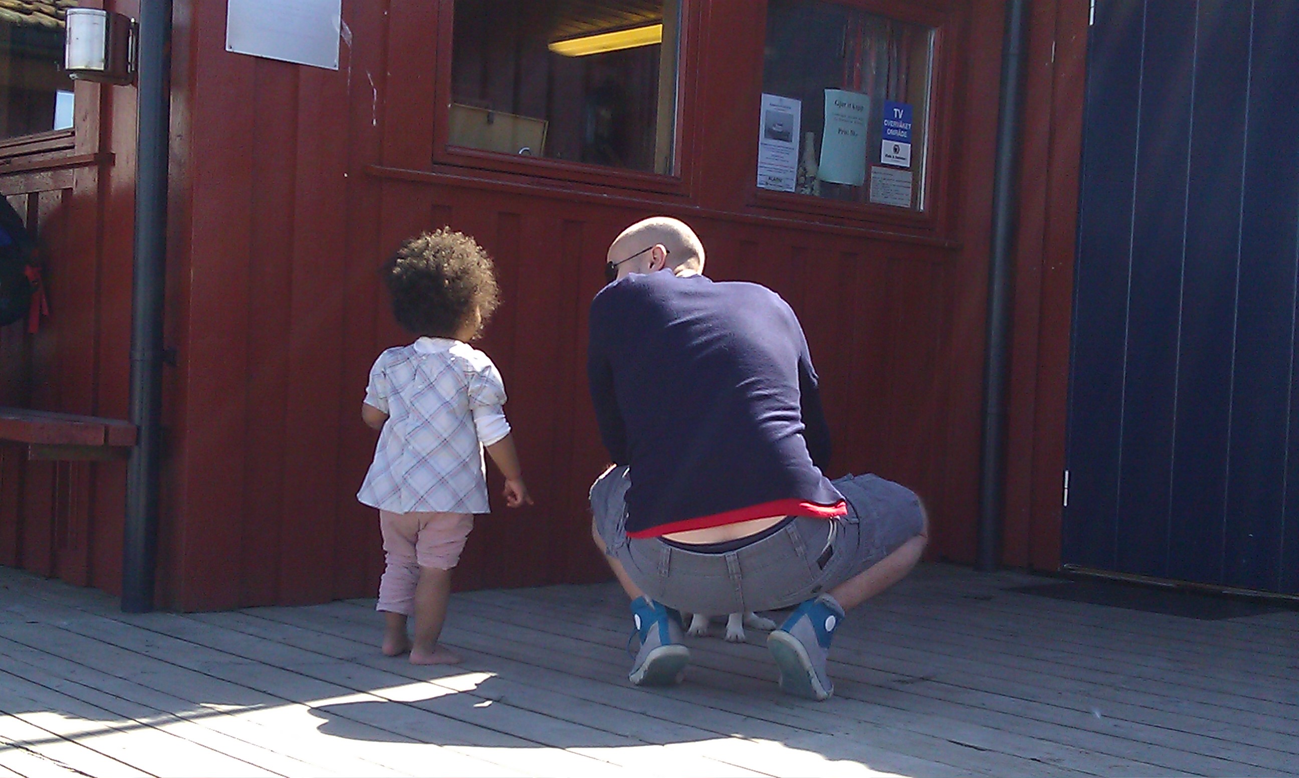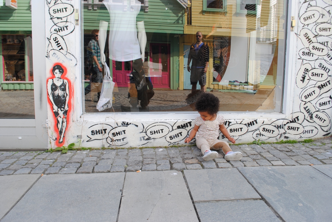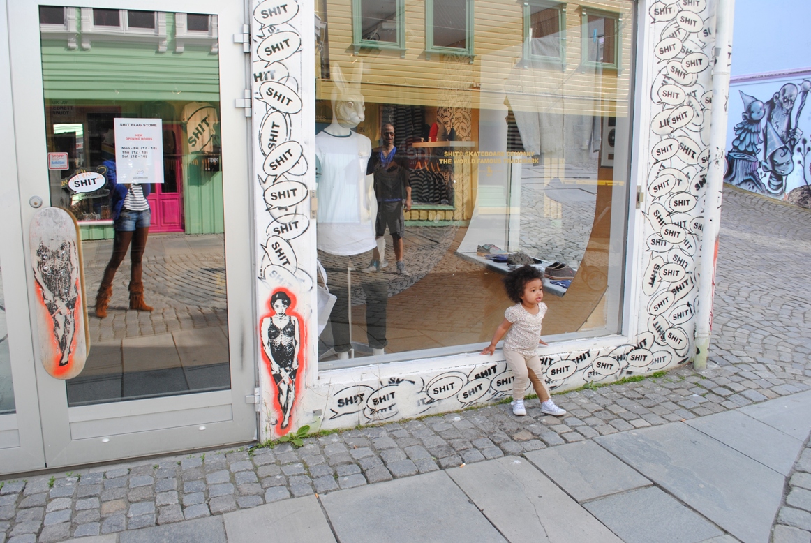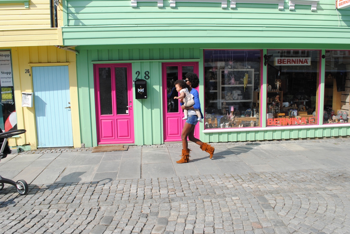 Pour me consoler, nous nous sommes dirigés vers la très jolie Øvre Holmegate, un de mes endroits préférés de Stavanger. L’Ôm était beau, comme toujours, et Ay, débordante d’énergie. Les gens assis aux terrasses se retournaient, intrigués et amusés par ce bulldozer version minipousse qui courait comme une flèche en poussant des cris de joie, et qui l’instant d’après, s’asseyait calmement le temps d’examiner des petites herbes.
