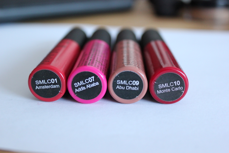 Je ne vais pas faire ma savante côté maquillage, je n’y connais que dalle, je suis juste super contente de ces couleurs à lèvres avec leur joli fini mat, leur longue tenue et leur petit prix (5$99 l’unité, shoppés via Ebay). Mes deux préférés restent Monte Carlo et Abu Dhabi, que je ne quitte plus ces derniers temps, mais vivement les couleurs un peu fraîches du printemps histoire que j’arbore le rose et le rouge vif.
