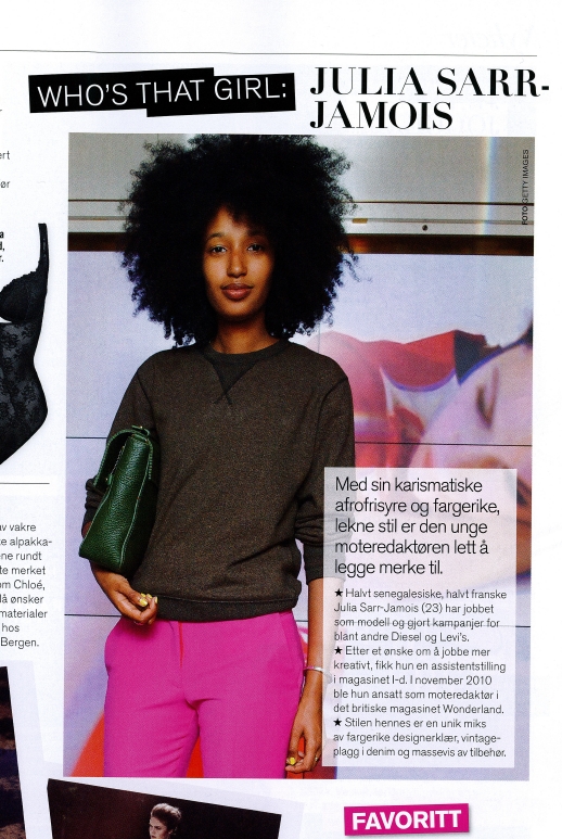 Lorsqu’Amayah s’est écriée : « Se mamma! Amayah sitt hår! » (Regarde maman, les cheveux d’Amayah!) en montrant cette photo de Julia du doigt, ca m’a fait énormément plaisir. Ca n’est peut être rien aux yeux de beaucoup, mais sans faire de l’ethnocentrisme de base je me suis dit que pour une petite fille couleur café au lait portant fièrement son nuage de coton en pleine Norvège, de voir quelqu’un qui lui ressemble dans un magazine ne pouvait être qu’une belle réaffirmation de son existence, de sa différence.