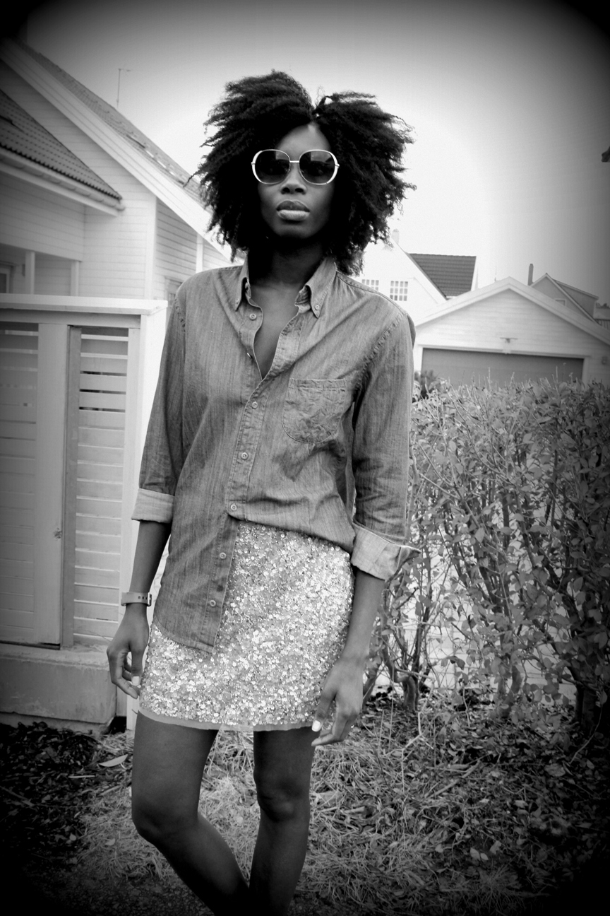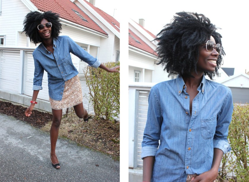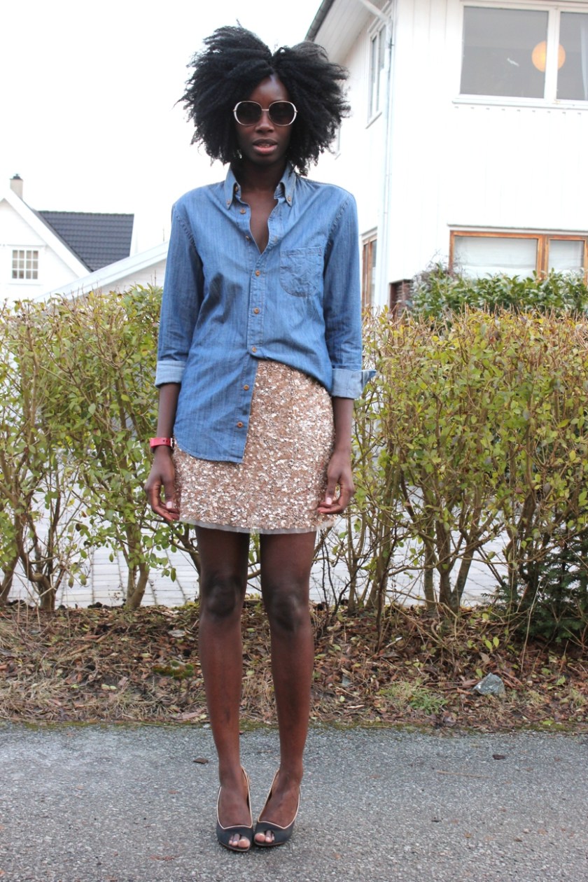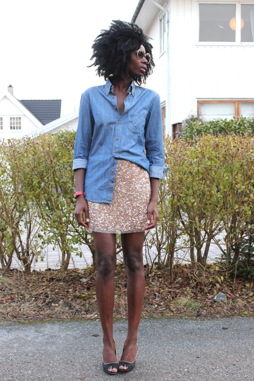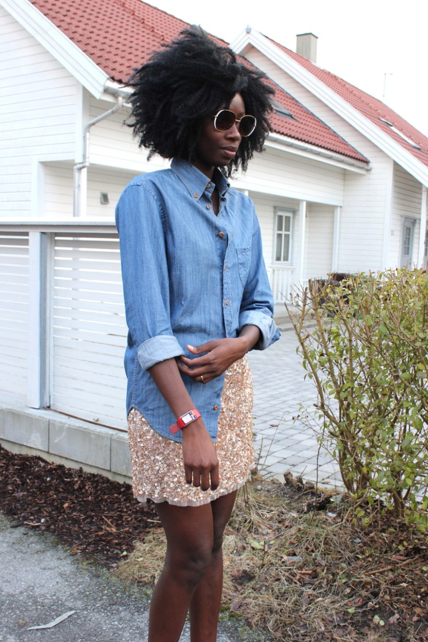 J’adore ta manière de porter la chemise en jean, et l’association avec la robe à sequins!