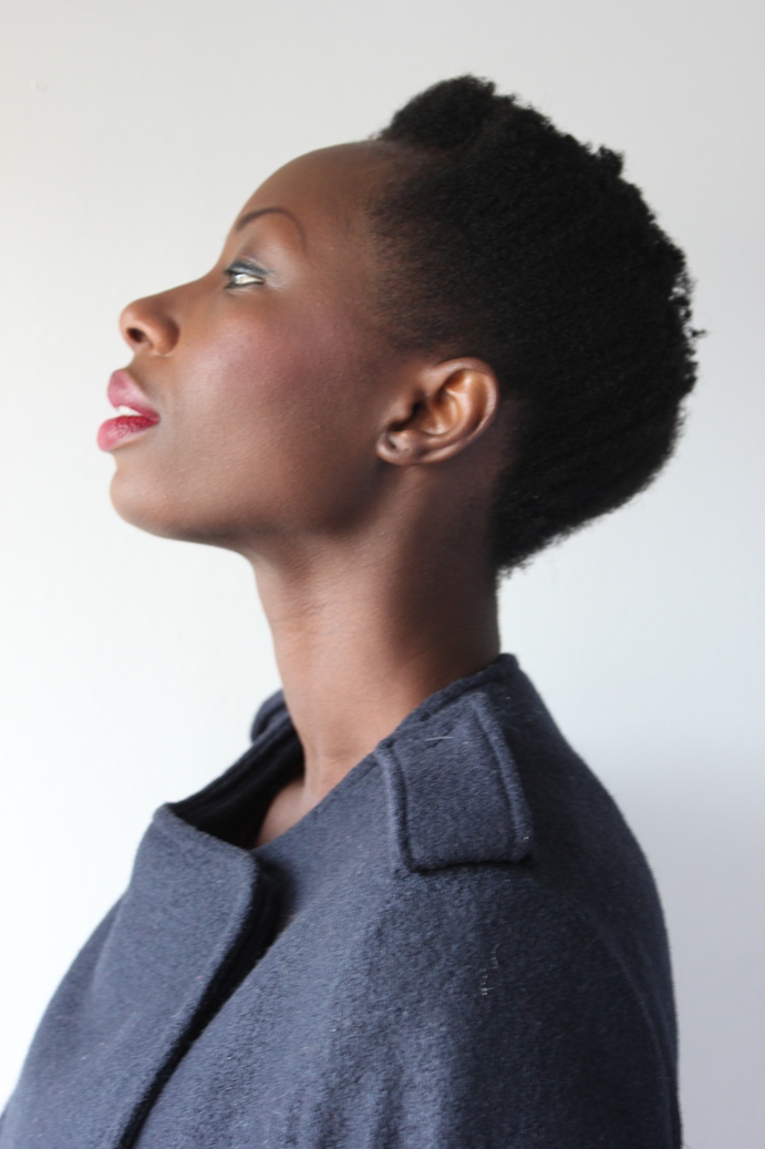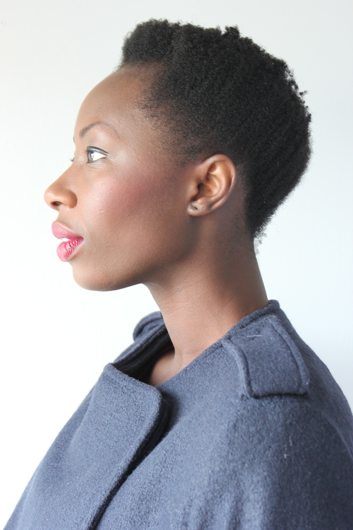 J’avoue que depuis que j’ai retiré mon afro et retrouvé mes cheveux et leur désolant statut quo, je suis un peu déprimée du tiff. Non seulement ils sont secs et cassants, ont toujours la pièce de 2 euros au centre, et sont tellement enroulés qu’ils semblent ne pas avoir poussé depuis un an. De plus, ils sont encore trop courts pour me permettre d’avoir des jolis twists ou puffs, et trop longs pour avoir une vraie coupe à la garconne comme dans le billet éponyme (je fais ma journaliste, oui oui!). Un vrai casse tête en somme. Du moins, jusqu’à ce que je reveille avec les côtés aplatis, et aies la brillante idée de tenter une coupe plus structurée et géométrique que le twa flou que je portait jusque là. J’me suis donc mouillé les cheveux sous la douche, et j’ai brossé tout vers le haut avec ma brosse Tangle Teezer et puis j’ai bien aplati le dessus (mais ca se voit plus parce que je tritouille constamment mes bouclettes).