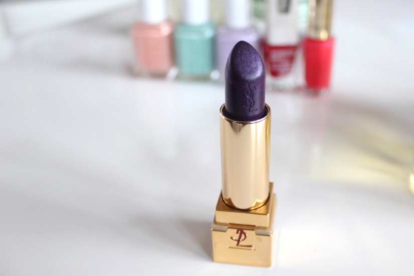 - Rouge Pur Couture Golden Lustre 101 Violet Singulier de Yves Saint Laurent: Le premier de ma quête (non achevée encore) du rouge à lèvres violet, et celui que je regrette un peu dans le lot. Bien que j’aime la tenue et l’intensité de la couleur, la teinte est bien trop sombre pour l’effet « violine » que je recherche. De plus le rouge à un parfum sucré qui me rebute un peu, résultat, je ne prends pas vraiment plaisir à le porter. Pour celles qui sont plus claires de peau en revanche, il peut être sublime (comme je l’ai vu chez Fatou de BlackBeautyBag), et j’avoue que porté au dessus de mon crayon Magenta de MAC, on se rapproche beaucoup de l’effet souhaité. Pas suuuuper emballée donc, mais je le garde à défaut d’en voir un qui répond à toutes mes attentes. Ah oui, et une dernière suggestion à l’équipe de YSL, la prochaine fois, mettez nous un nom encore plus long, à mon humble avis, y’a encore 7 ou 8 mots qui seraient passés à l’aise sur l’étiquette #lesgens 0_O (vraiment, ca m’fait plaisir d’aider!).