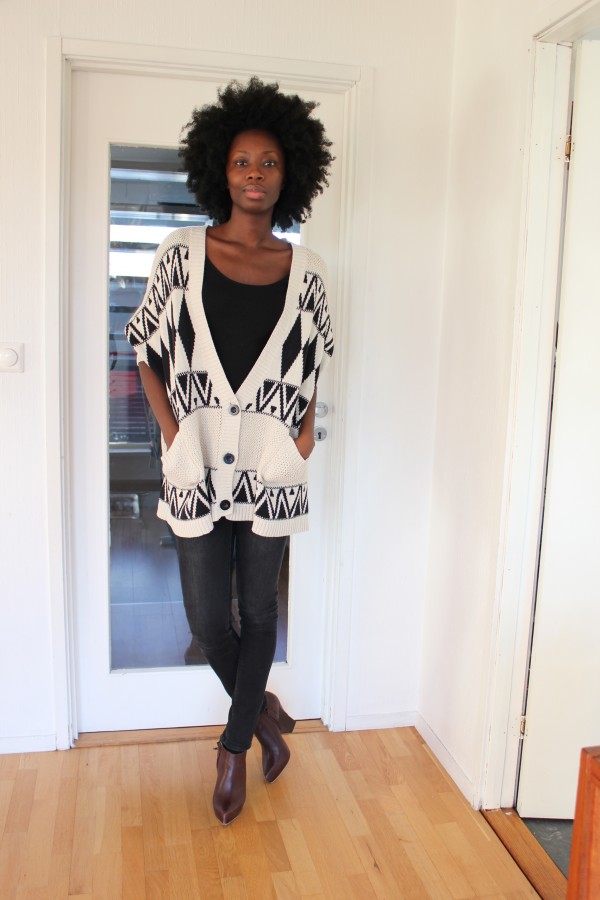 Ton afro est super, comment fais-tu pour obtenir cet effet frisé ? J’ai cherché sur internet comment l’obtenir mais je n’ai jamais trouvé ! Je trouve que ce qui rend ton cardi/poncho c’est sa coupe, puisque justement il est entre le cardi et le poncho lol. Et effectivement ta peau est vraiment belle !